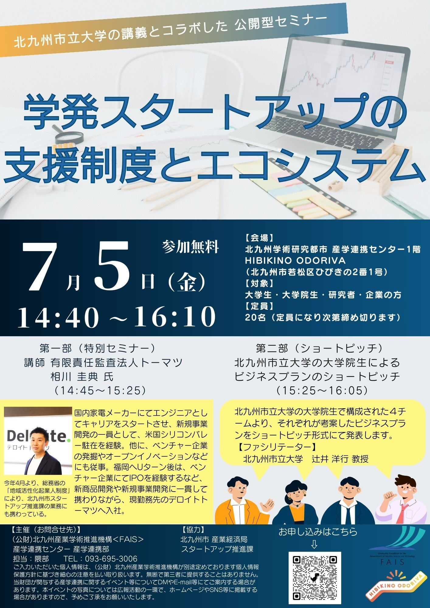 北九州市内のスタートアップが行う研究開発・実証・事業展開に対して、資金支援(最大1,000万円/年)・伴走支援を実施します。
