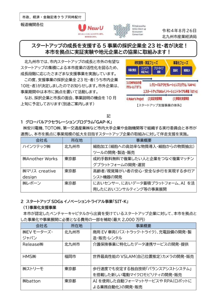 北九州市が行うスタートアップ企業支援施策5事業(通称:SEP-K)の採択企業が決定いたしました。詳細につきましては添付プレスリリースにてご確認ください!