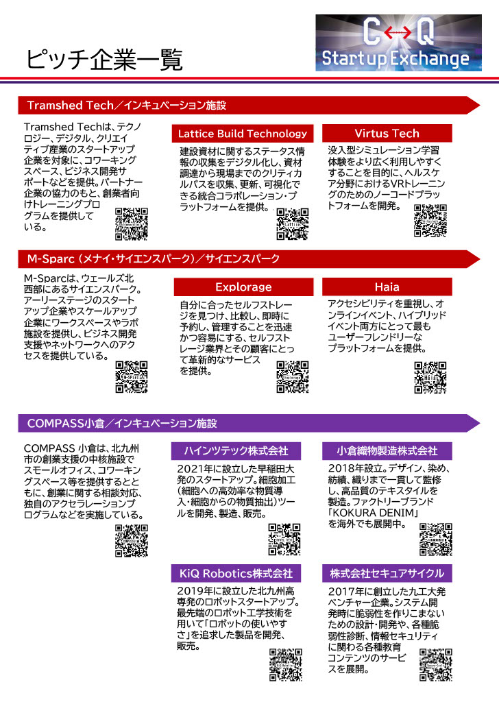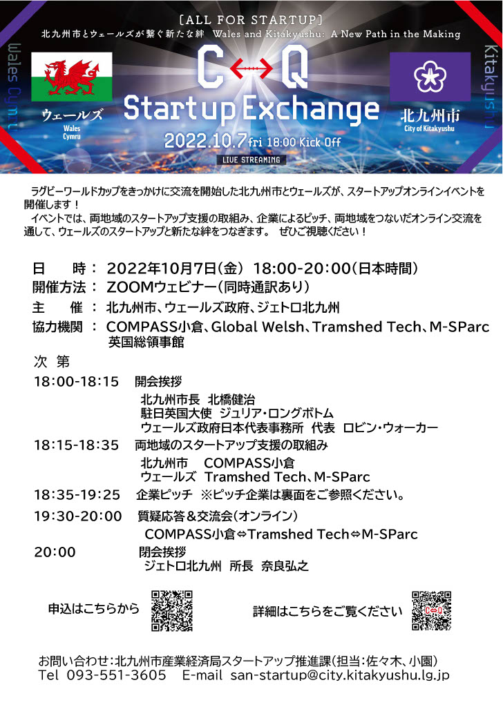 イベントでは、北九州市から4社(ハインツテック、小倉織物製造、KiQ Robotics、セキュアサイクル)、ウェールズから4社(DX、VRなど)、計8社のピッチ(録画)を紹介するととともに、COMPASS小倉とウェールズの2か所のインキュベーション施設をつないだオンラインの交流を行います。