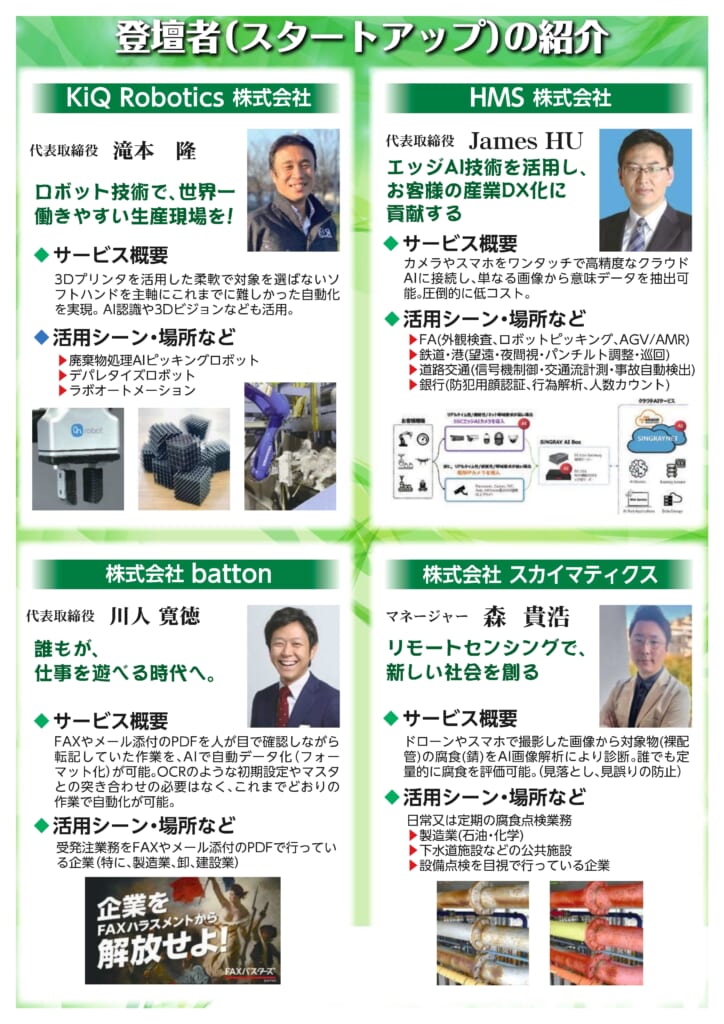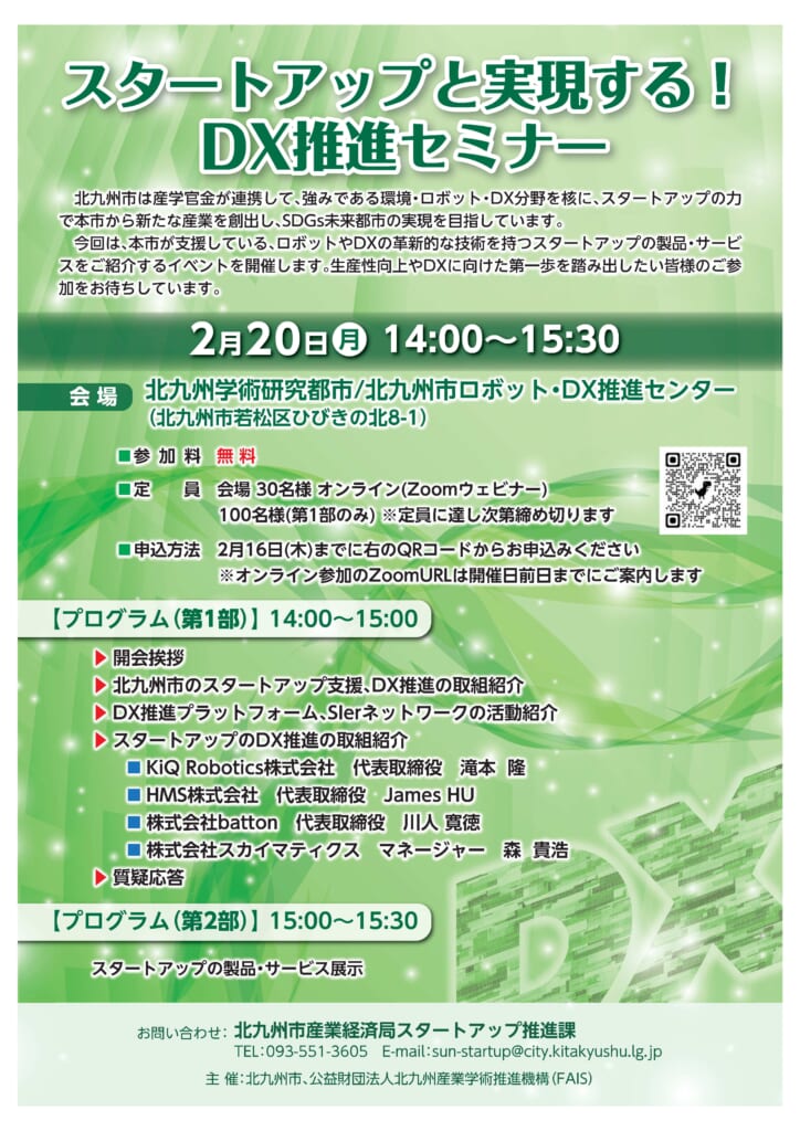 北九州市のDX推進の取り組みや本市が支援しているロボットやDXの革新的な技術を持つ、スタートアップの製品・サービスをご紹介するイベントを開催します。生産性向上やDXに向けた第一歩を踏み出したい皆様のご参加をお待ちしております。