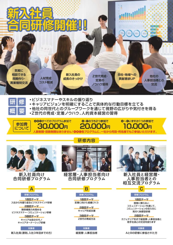 この度、市内企業の人材育成にかかる負担を軽減するため、新入社員、企業の経営層・人事担当者向けに