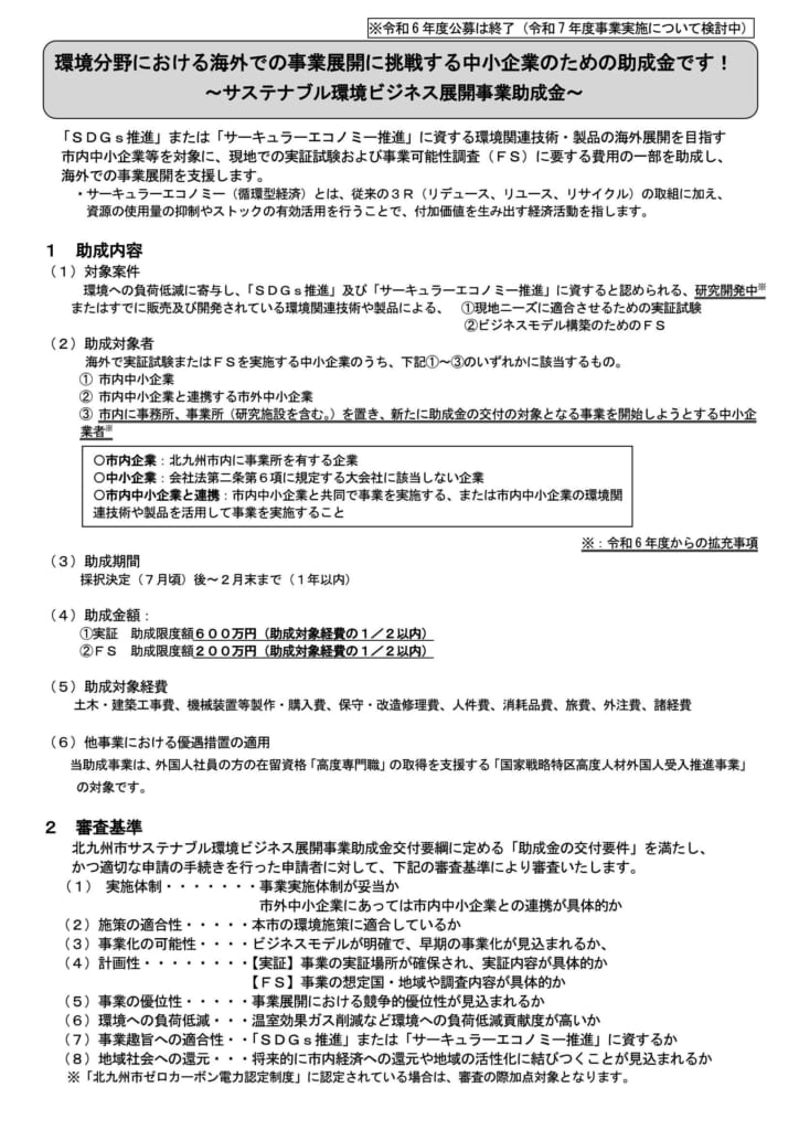 「SDGs推進」または「サーキュラーエコノミー推進」に資する環境関連技術・製品の海外展開を目指す市内中小企業等を対象に、現地での実証試験および事業可能性調査(FS)に要する費用の一部を助成し、海外での事業展開を支援します。令和6年度から対象案件を研究開発中のものにも広げています。