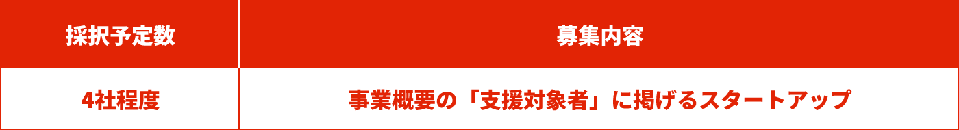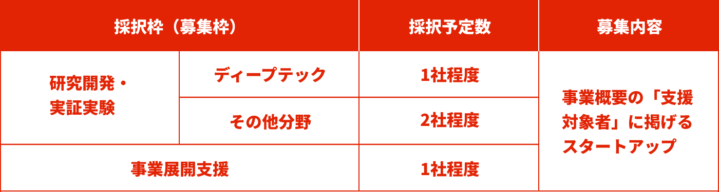 (1)各プログラムにおける各採択枠に記載の採択社数は、あくまで目安であり、スタートアップ公募の際に、応募者から提出される経費予算明細書の金額(資金支援申請額)に応じて、予算の範囲内で可能な限りの社数を採択する予定です。