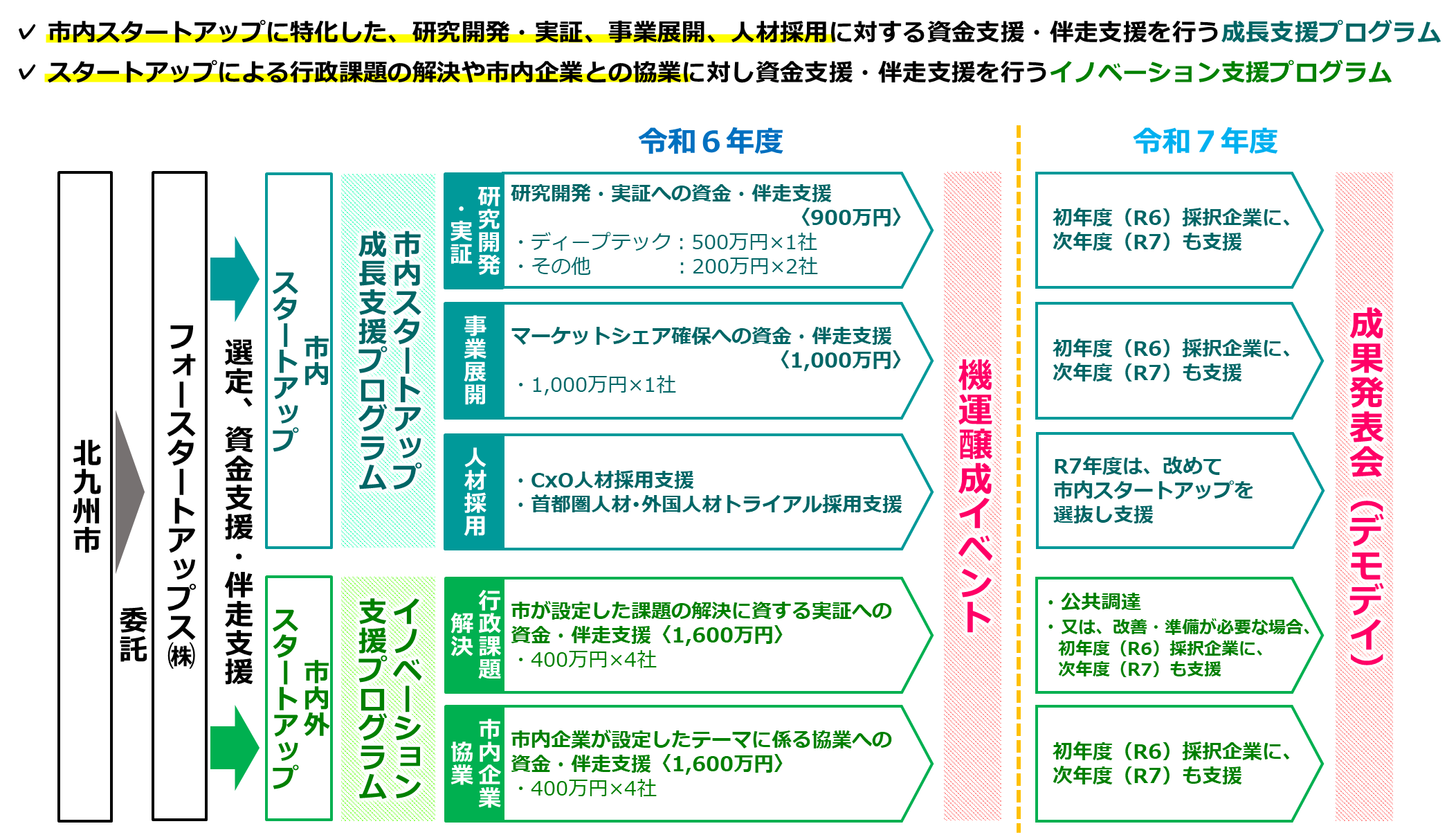北九州市が設定した課題を解決するためのスタートアップによる実証実験及び研究開発の実施、並びに試作品・サービスの開発・改良に係る調査・検討・開発・検証・準備等に対する資金支援・伴走支援を行うもの。