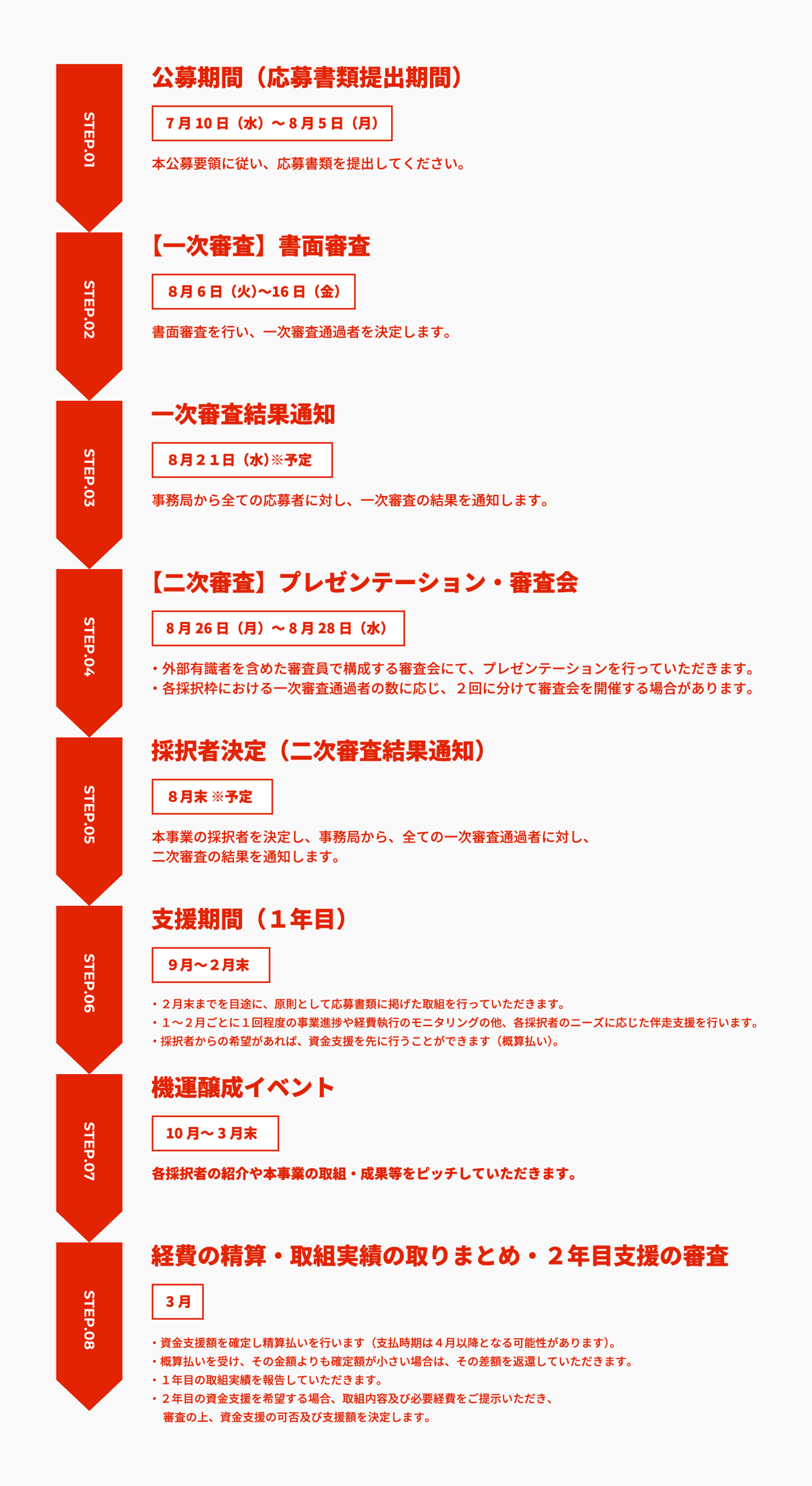 このうち、(1)~(4)については、支援プログラムの採択枠に応じて、応募の資格要件に関わる内容であるため留意してください。