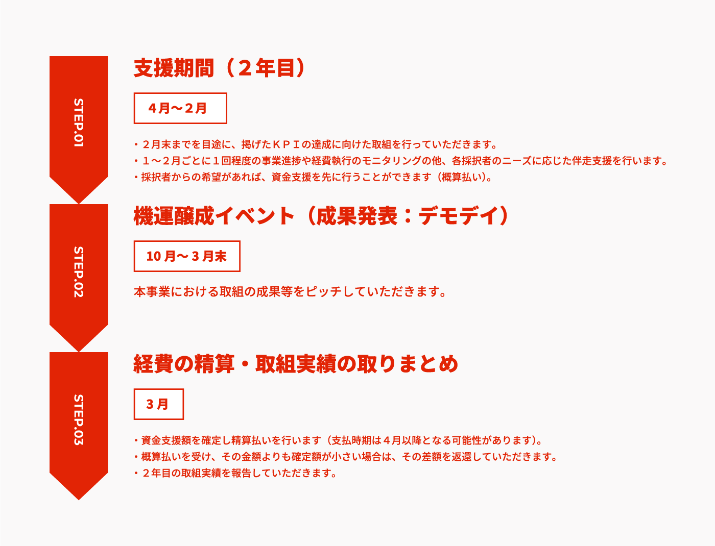 支援2年目(令和7年度)は、本事業における取組に関して設定したKPIを達成するために活動してください。下半期には成果発表会(デモデイ)を開催しますので、令和6年度採択スタートアップは全て参加し、成果発表(ピッチ)を行っていただきます。